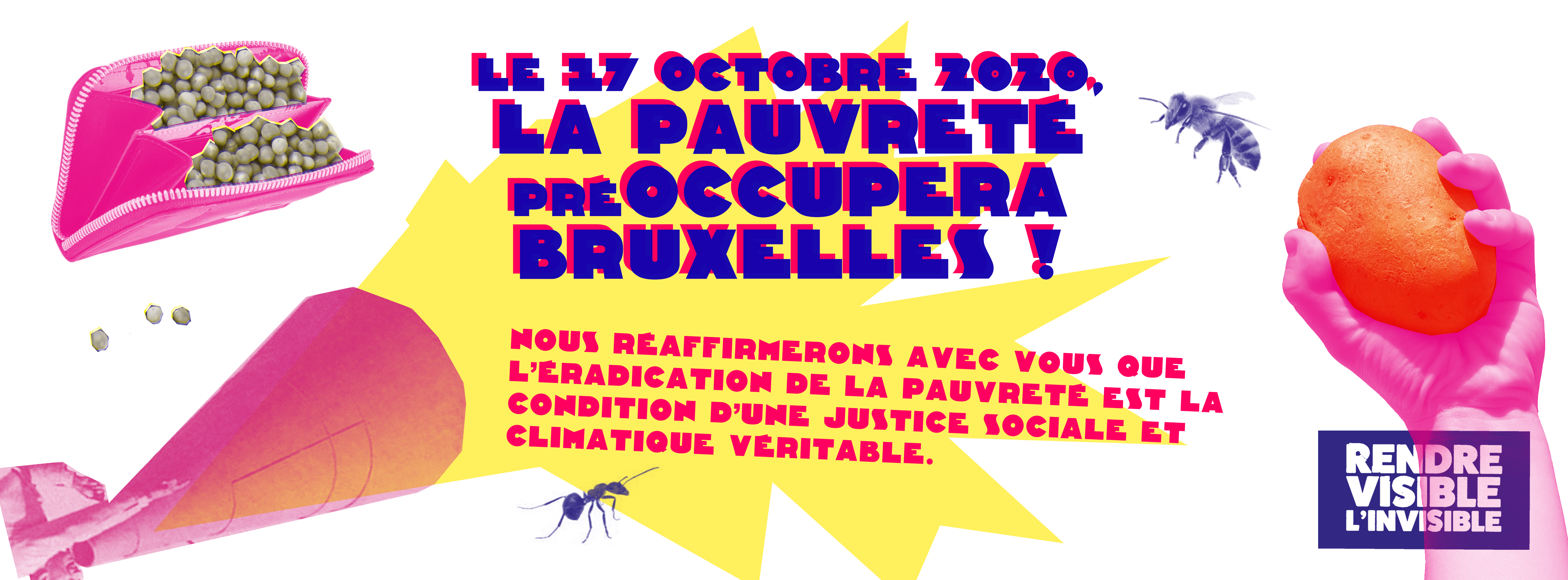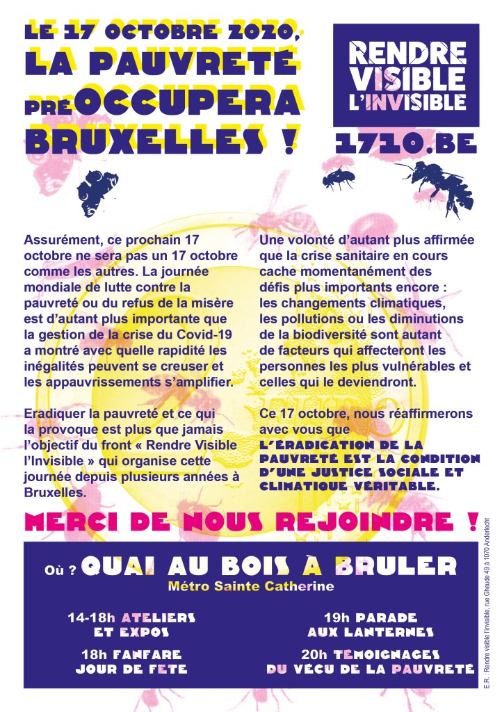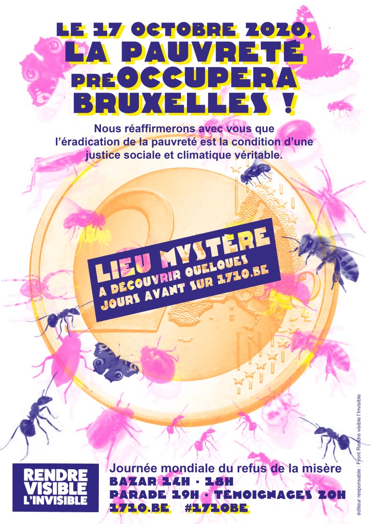 Ce 17 octobre à Bruxelles, des citoyen.e.s et plus d’une trentaine d’organisations du secteur social et environnemental se mobiliseront à l’occasion de la Journée mondiale de lutte contre la pauvreté. Pour nous aider à porter la voix des plus précaires, diffusez et invitez largement autour de vous !